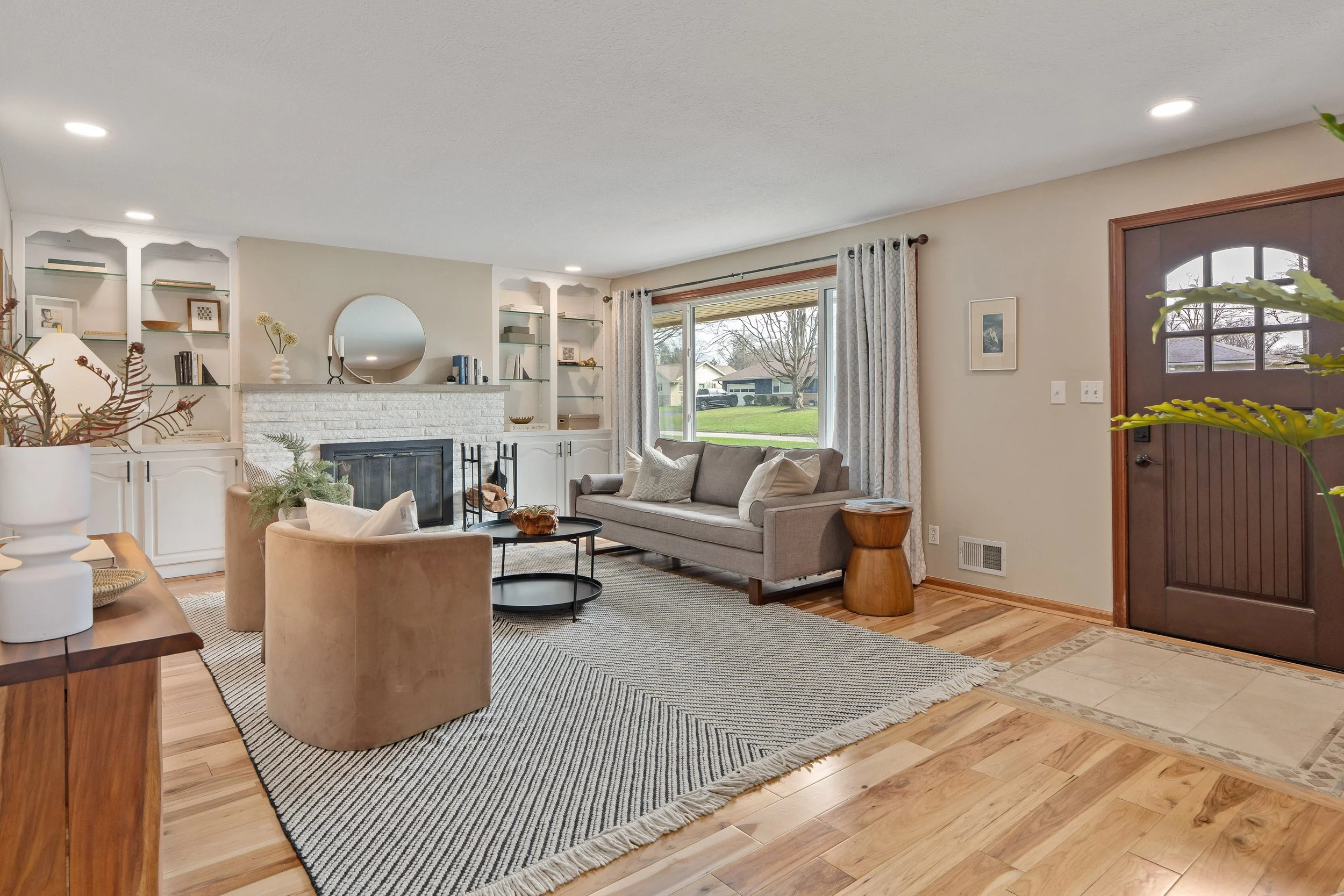 Unassuming from the street, this Upper Arlington ranch style home quietly offers over 3,000 square feet of finished living space. Features include: a desirable open floor plan and vaulted ceiling in living/ dining and kitchen areas, hickory hardwood floors, gas log fireplace, double glass sliding doors to patio, yard and pool, eat-in kitchen loaded with storage and counter space, bar seating for eight, quartz countertops and stainless steel appliances, first floor laundry and powder room. In the front of the home is the family room with built-in cabinetry and wood burning fireplace. The primary suite features sliding glass doors to deck/ hot tub area, walk-in closet and bath with jetted tub/ shower. There are two nice sized guest bedrooms and guest bath with a larger 3rd bedroom (formerly the primary). Downstairs: a den/study/ 5th bedroom with egress window, recreation room with wood burning fireplace, a second full bath and great storage space. Outside: a private fenced yard, with patio, in ground pool, deck and hot tub. The home sits back on a sizable (just short of a half acre) corner lot just West of Kingsdale Shopping Center, Bob Crane Community Center and with easy access to all Upper Arlington destinations.